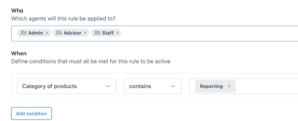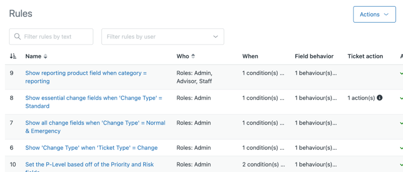 With each rule you create, specify under which conditions it should apply. For example when a ticket has a certain tag, a checkbox is checked, or a dropdown has any value, or a combination of these. You can also define to which agents the rule should apply to. All this gives you the control you need over your forms and what your agents see and when!